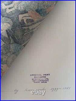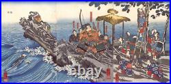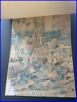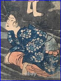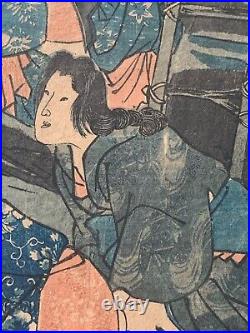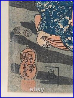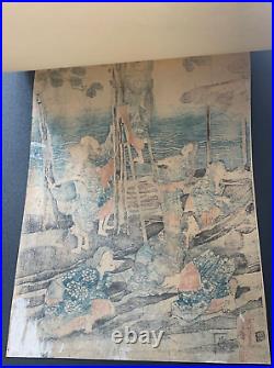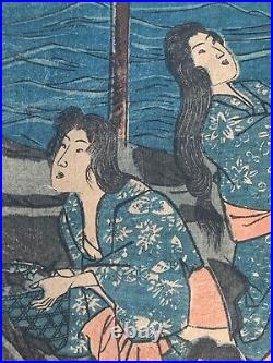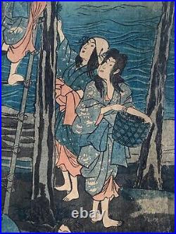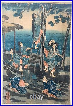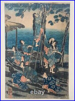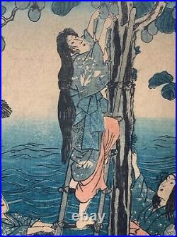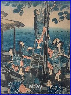 Antique UTAGAWA KUNIYOSHI Japanese Woodblock Tametomo Women Picking Fruit c1850. Original Antique UTAGAWA KUNIYOSHI Japanese Woodblock Part of triptych. Tametomo in his island kingdom, seated on a rock, watching native women picking fruit and diving for awabi (abalone). This is a lovely and very rare antique original print by Utagawa Kuniyoshi women picking fruit by the sea. It is right sheet from triptych and comes with a stamped and hand written Certificate from Sekai. Please note that the last photo is for reference only, source: Kuniyoshi Project, 2024. Utagawa Kuniyoshi (1798- 1861) was one of the last great masters of the Japanese ukiyo-e style of woodblock prints and painting. He was a member of the Utagawa school. The range of Kuniyoshi’s subjects included many genres: landscapes, women, Kabuki actors, cats, and mythical animals. He is known for depictions of the battles of legendary samurai heroes. His artwork incorporated aspects of Western representation in landscape painting and caricature. Condition: Very good condition. Colors are fresh, mild fading and rubbing commensurate with age and use. Lightly taped to matting (easily removable). Framed under glass with black lacquer frame. Last photo for reference only. 4 1/4 x 9 5/8 inches. Overall: 17 x 12. Unless described as being new, the items for sale are vintage or used and it may show evidence of wear. The description refers to the overall condition and details. We try to describe the items to the best of our ability. All listings are described as to the best of my knowledge, through careful research and price and description comparison. With tracking and careful, sturdy packing, we try to recycle when possible. We welcome all reasonable offers! We appreciate your business! Please check out my other items. Thank you for looking and good luck!